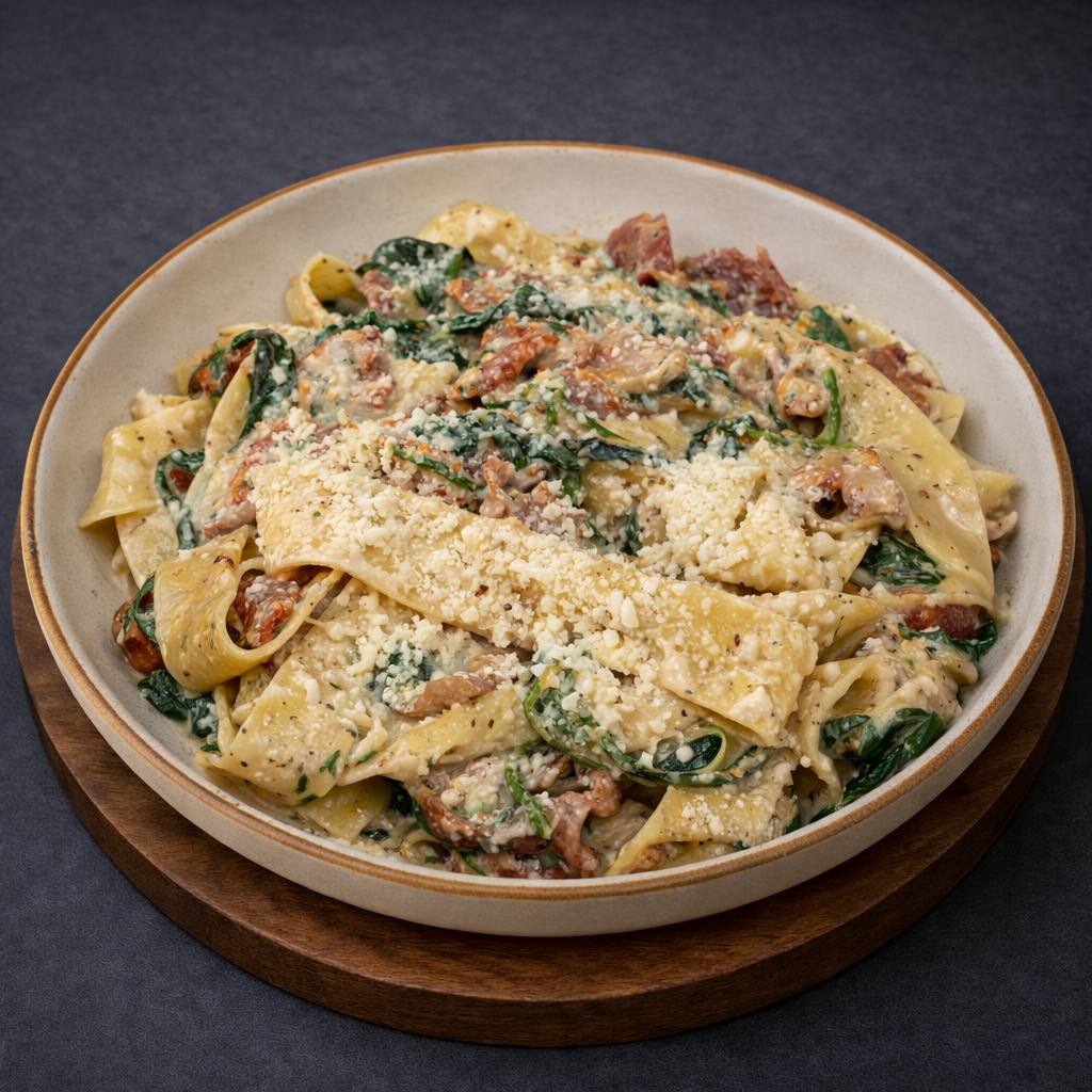 Boczek, szpinak, pomidory suszone, gorgonzola, sos śmietanowy, parmezan